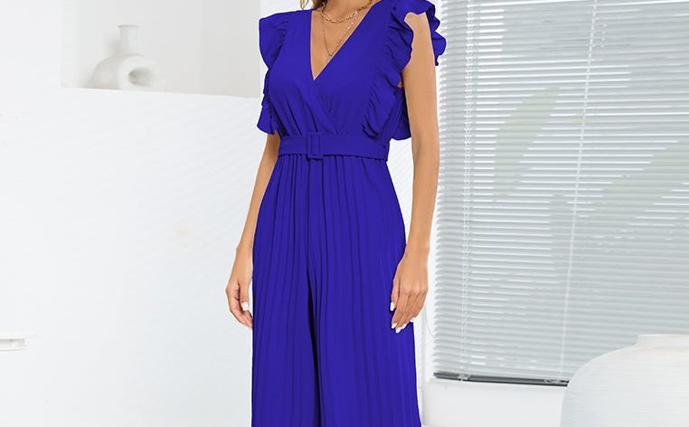 Embrace Effortless Elegance: The Women’s Ruffle Cap Sleeveless V Neck Jumpsuit With Belt in Deep Blue